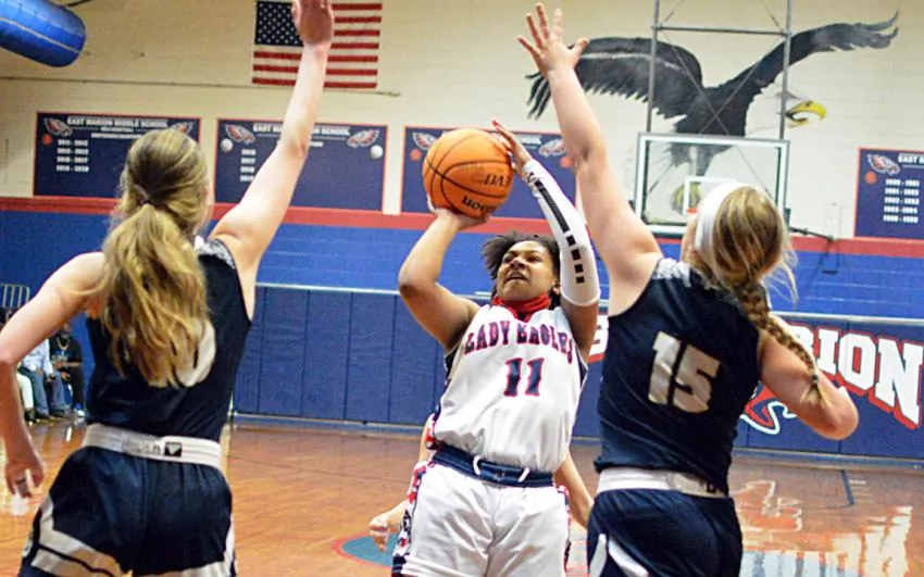 Destiny Brown paced East Marion with an elite all-around performance with 17 points, 12 rebounds, seven assists and five steals. Ellen Porter (six rebounds), Jayda Porter (five rebounds) and Lia Smith (seven rebounds) each had eight points, and Dyani Weary had six points and six boards.