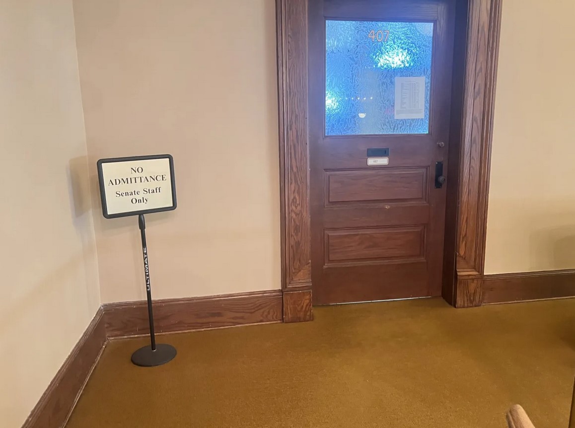 The committee hearing occurred on April 23 at 1 p.m. in room 407, a small room tucked away in a corner of the fourth floor observation balcony, behind a scanner, a security guard, an assistant’s desk and a sign that says “NO ADMITTANCE Senate Staff Only.” (John Sewell, IHL’s spokesperson, said he did not recall the sign being outside the door that day.)
