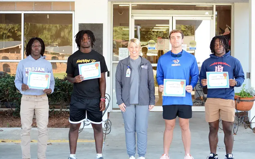 The Players of the Week for Week 5 are pictured with Marion General Hospital’s Brooke Watts. They are, from left, West Marion’s Brayson Pittman, Columbia’s Ashton Daniels, Columbia Academy’s Cash James and East Marion’s Jaquez Hathorn.