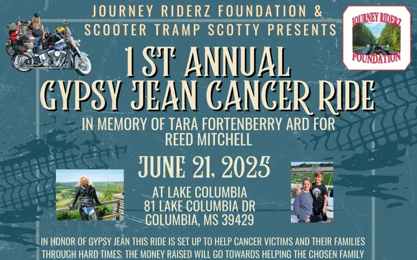 The First Annual Gypsy Jean Cancer Ride at Lake Columbia is set for June 21 in honor of Tara Fortenberry Ard. The event, presented by the Journey Riderz Foundation and Scooter Tramp Scotty, will benefit Ard’s son, Reed Mitchell.