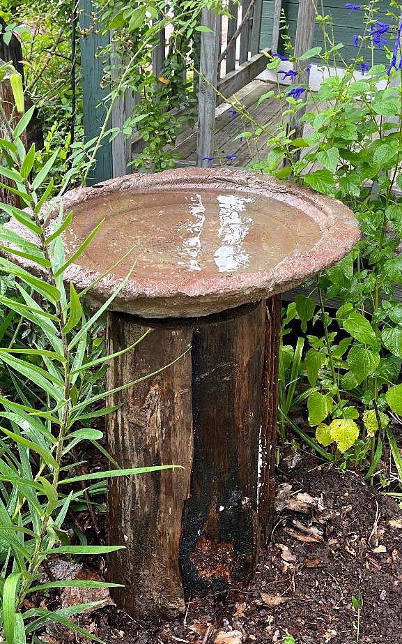 My main two water gardens with their splashy fountains are fine for furry critters, but birds, butterflies, and bees need shallow water with quiet edges. Which brings me to birdbaths.