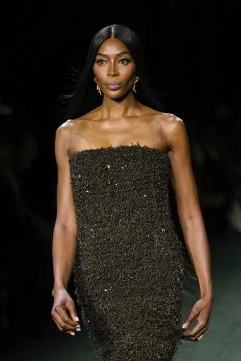Supermodel Naomi Campbell, sashaying in a shimmering bronze strapless column gown, rounded out the show.