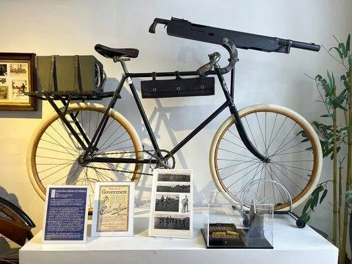 The military went further, mounting a Colt machine gun on an 1896 Columbia Model 40. The museum’s model has a storage case for ammunition and assorted supplies mounted on the rear rack.