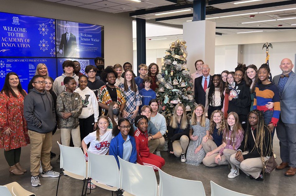 U.S. Senator Roger Wicker, R-Miss., yesterday visited the Vicksburg Warren School District’s Academy of Innovation where students presented him with individually-made ornaments to decorate the Christmas tree in his Washington, D.C., office. This is the fourth time that Wicker has invited a Mississippi school to create ornaments for his Washington office.