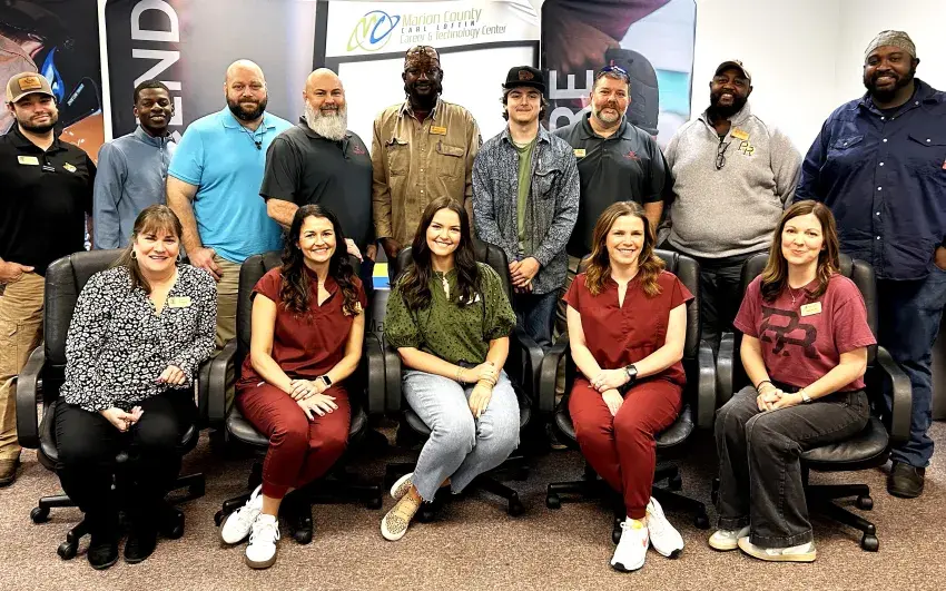 Marion County Carl Loftin Career and Technology Center hosted Pearl River Community College (PRCC) guest speakers on Feb. 26. Amy Baughman, Student Services Coordinator, invited PRCC recruiters, student services representatives, CTE program instructors and CTE program students into classrooms to speak to second-year career and technical education students. The speakers shared valuable information about potential CTE careers, admissions to the college, scholarship opportunities, basic college information and college preparations. Front row, from left, are Eileen Sumlin, Student Services Coordinator; Brett Malette, Nursing Instructor; Juliana Moore, Recruitment and Marketing Specialist; Frances Wright, Respiratory Therapy Instructor; and Cassie Jackson, Student Services Coordinator; back row, Danin Stevens, Automotive Technology Instructor; Travel Hinton, Recruiter; Corey Guerra, Graphic Design Instructor; Rodney Clark, Drafting Instructor; Jonathan Williams, Welding Instructor; Joshua Bayer, welding student; Brad Frazier, Electronics Technology Instructor; Rashan Foxworth, Construction Instructor; and Frederick Douglas, welding student.
