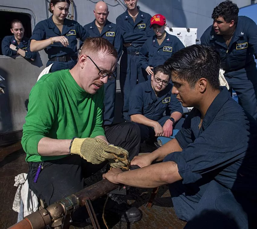 SOUTH CHINA SEA — U.S. Navy Aviation Electronics Technician 2nd Class Caleb Gremmel, from Columbia, Miss., left, practices using a soft patch during a damage control exercise aboard the aircraft carrier USS Nimitz (CVN 68). Nimitz is in U.S. 7th Fleet conducting routine operations. 7th Fleet is the U.S.