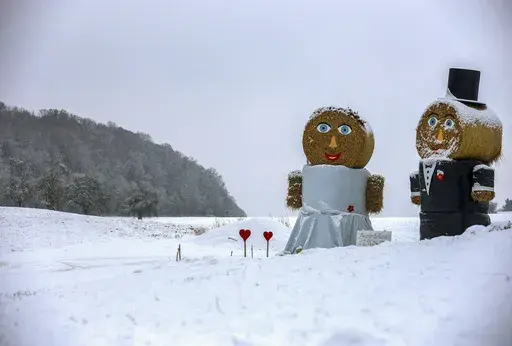 In Germany, people walked across the Hohenzollern Bridge in Cologne, where an estimated 500,000 “love locks” were attached, the padlocks engraved with inscriptions of lovers. In Erbstetten on the Swabian Alb, a wedding couple was made of bales of straw.