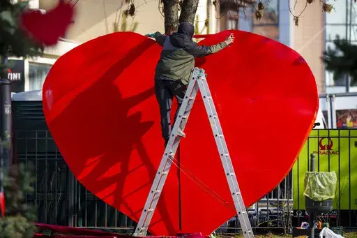 But love was also on display in far less iconic locales: A couple kissed on a park bench in Bucharest, Romania. Florists made bouquets in a flower shop in Lagos, Nigeria. Heart-shaped plaques were tied to a tree branch at a shrine in Tokyo.