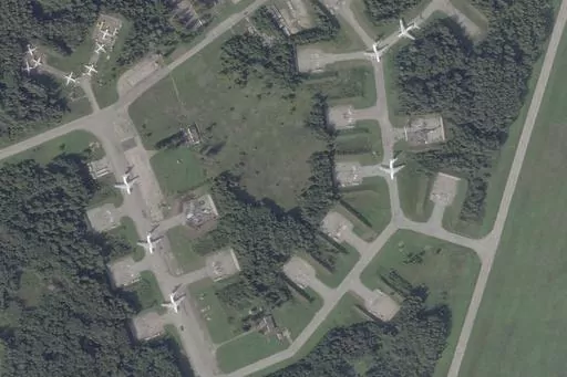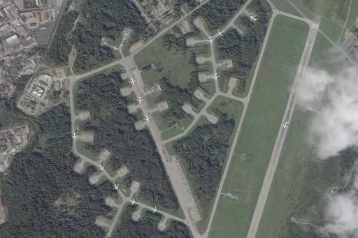 The images taken Thursday show Princess Olga Pskov International Airport, which is a dual military-civilian airport about 700 kilometers (400 miles) north of the Ukrainian border and near Estonia and Latvia.