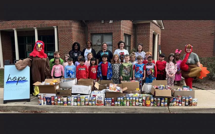 West Marion Primary classes competed to collect as many cans as possible during the month of November to donate to Hope Collective Community. 1,248 canned food items were donated, and 153 of those were donated from Rebekah Martin's class. Since her class collected the most cans in the school, Martin and her student teacher, Katie Sauls, were the 2023 WMP Turkeys for the day. It was a fun day, but most importantly, the students learned the importance of giving to their community. | Photo submitted