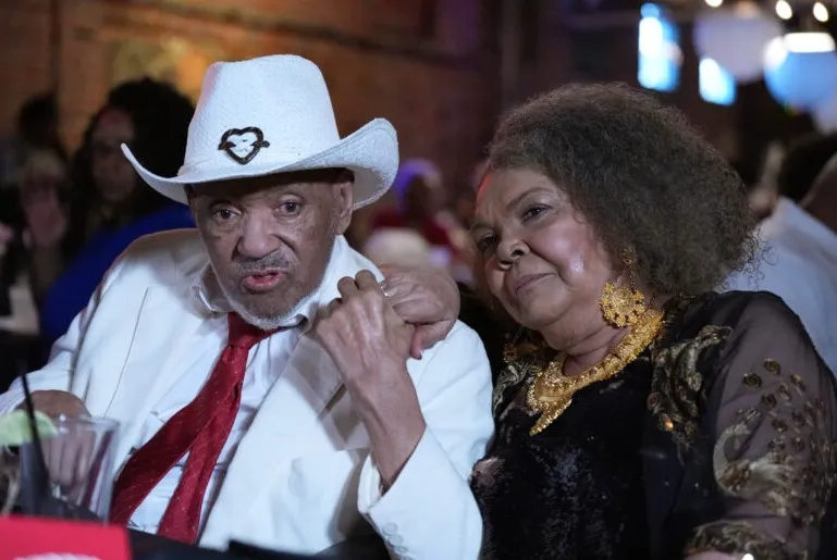 Judy Alsobrooks Meredith, right, wife of James Meredith, who became the first Black student to enroll at the University of Mississippi in 1962, shares a moment with her husband during his 92nd birthday celebration at a Jackson, Miss., restaurant, Wednesday, June 25, 2025. Credit: Rogelio V. Solis/Mississippi Today