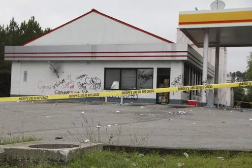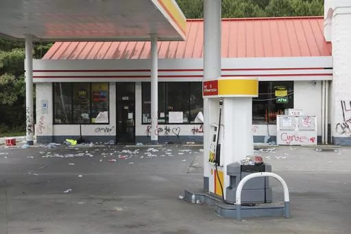 The entire gas station was behind yellow crime scene tape Tuesday morning. Dozens of crushed water bottles littered the parking lot. Graffiti, most of it “Cyrus” or “14” covered the walls.
