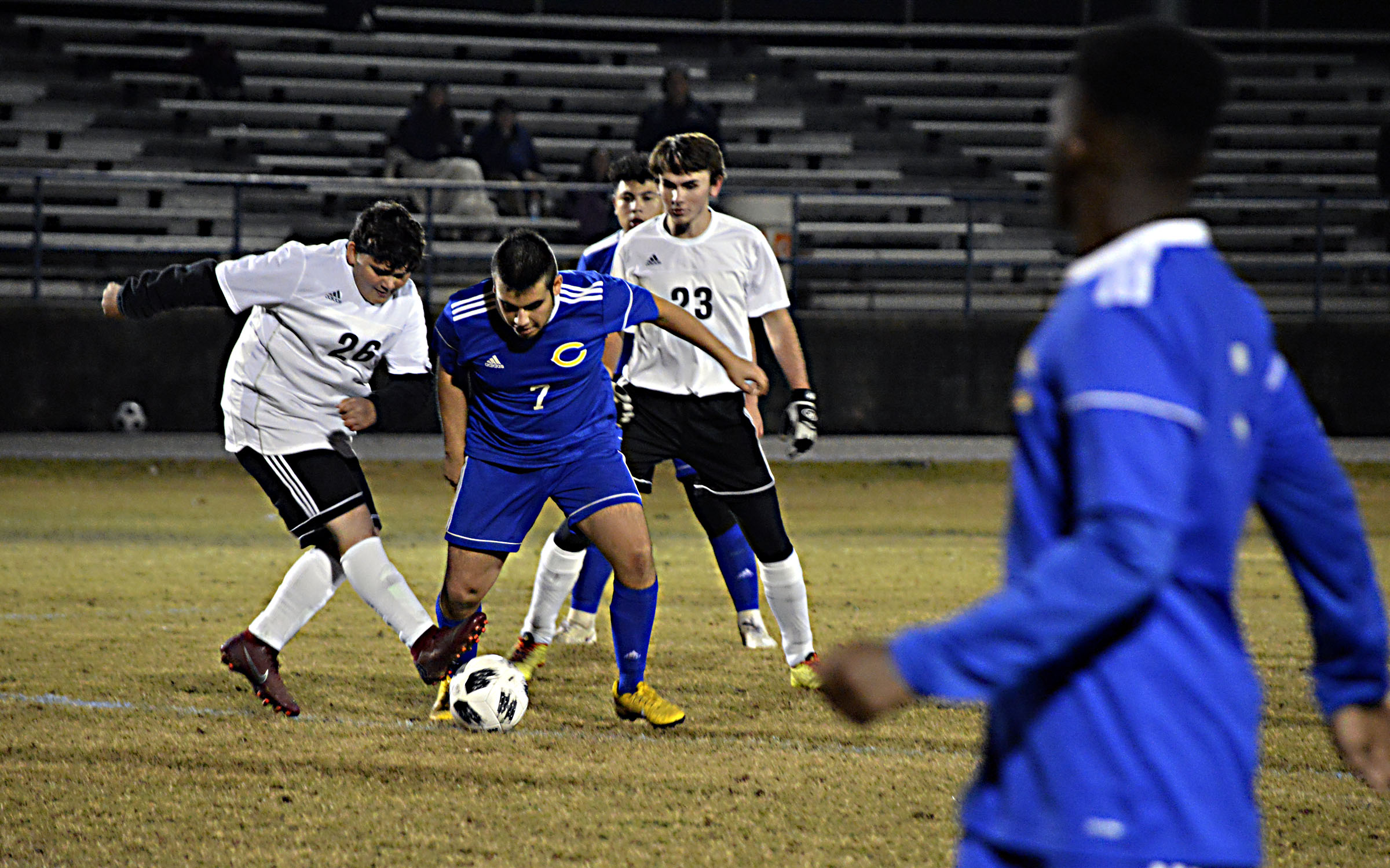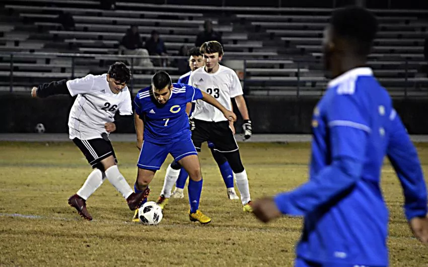 Pictured Above: Columbia’s Freddy Mata fends off a Lawrence County defender Nov. 27 in a 7-1 loss as he dribbles the ball up the field. The Wildcats, however, responded in their next match to pick up their first win in program history against Mount Olive in a 2-1 decision Friday night. | Photo by Joshua Campbell