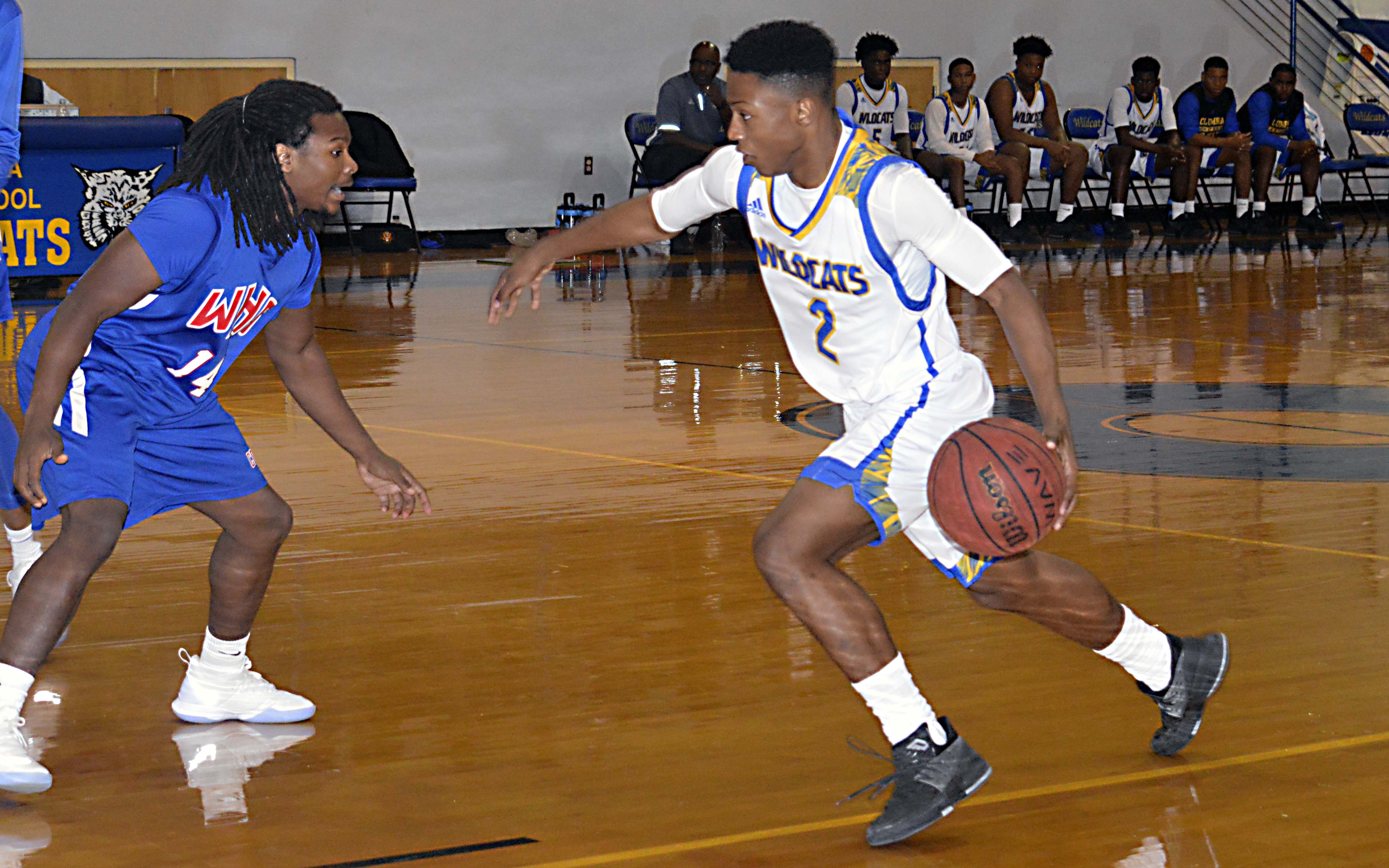 Pictured Above: District MVP TJ Monroe takes Wesson's Dell Thigpen off the dribble. | Photo by Joshua Campbell