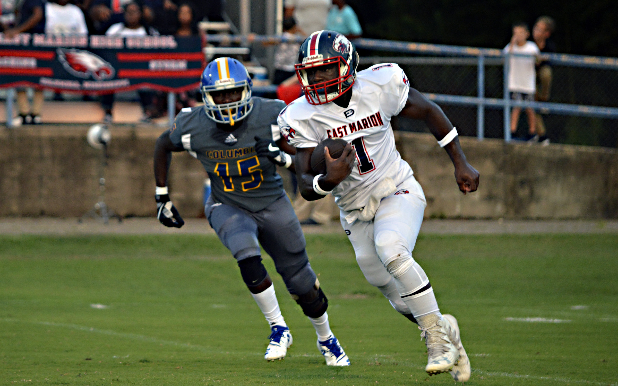 Pictured Above: East Marion quarterback Devin Daniels turns the corner against Columbia. | Photo by Joshua Campbell