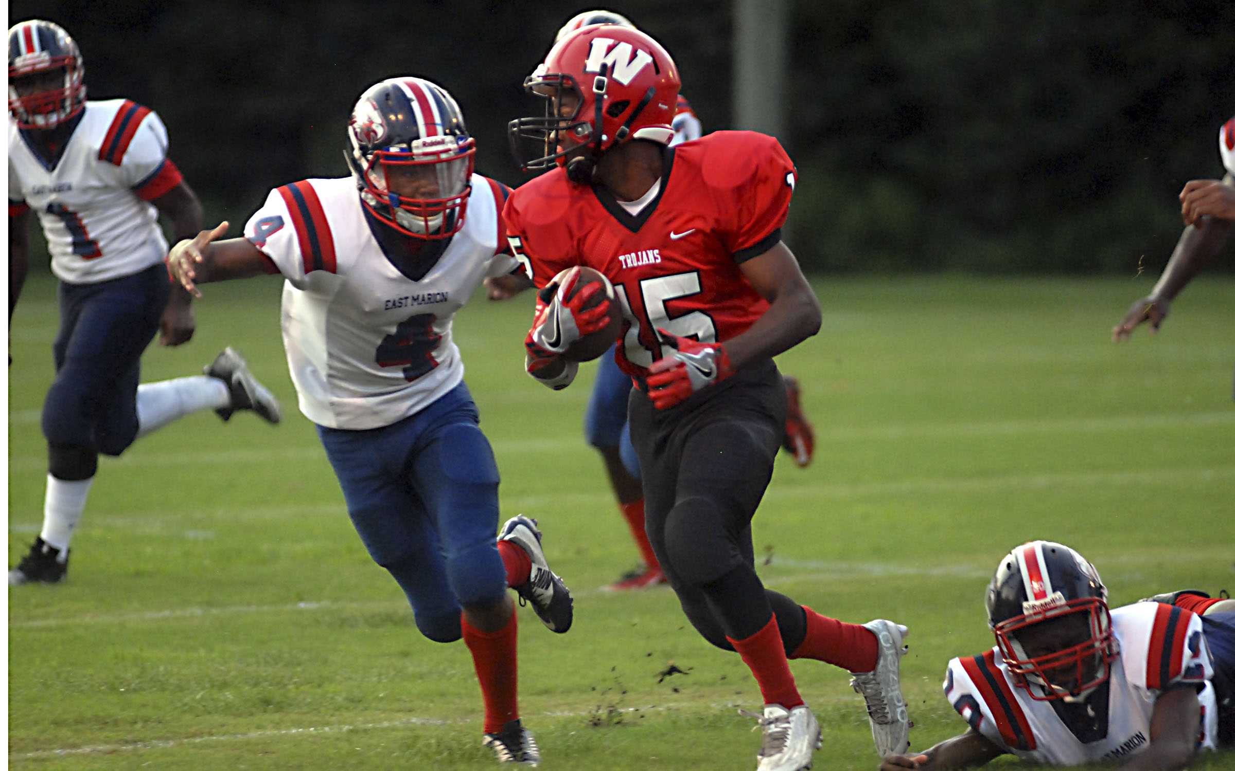Pictured Above: East Marion’s Lawrence Lambert attempts to corral West Marion’s Ketarious Cotton in this file photo. | Photo by Mark Rogers