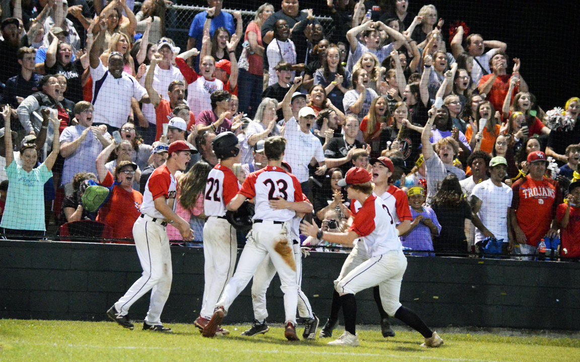 Pictured Above: The Trojans celebrate after scoring two runs in the bottom of the seventh inning to send the game to extras. | Photo by Joshua Campbell