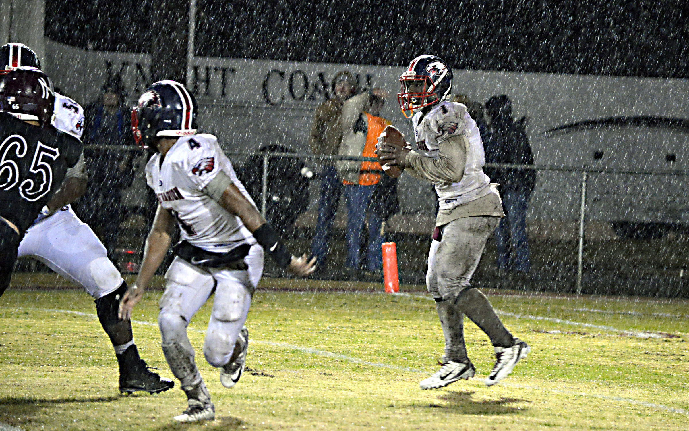 Pictured Above: East Marion's Devin Daniels stands tall in the pocket as rain falls at Nanih Waiya. | Photo by Joshua Campbell