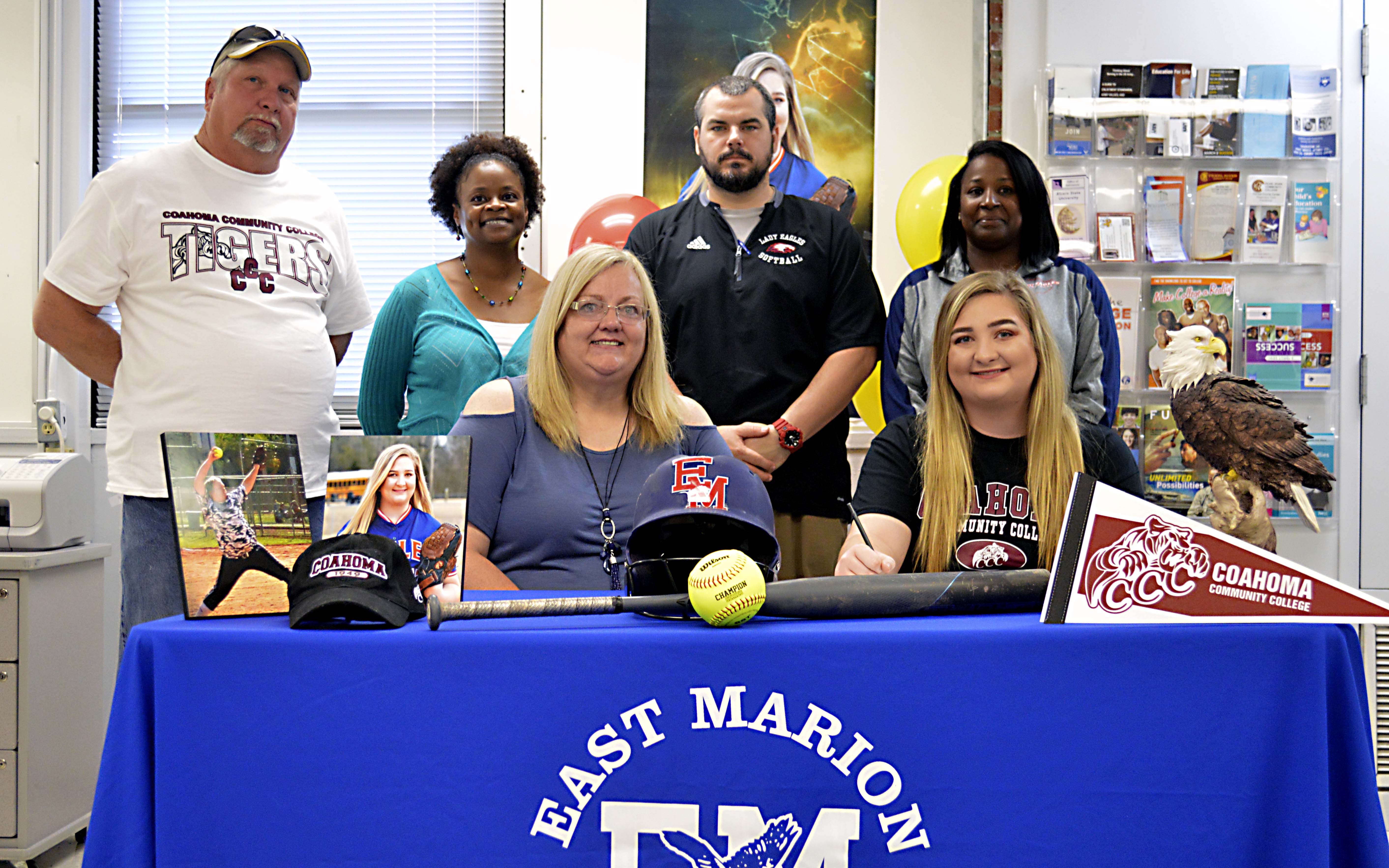 Pictured Above: East Marion’s Skyler Sistrunk, front row right, inks a scholarship with Coahoma Community College with her mom, Rita, by her side. Pictured in the back row, from left, are Sistrunk’s father, Reggie, Principal Cindy Newsome, head coach Jeremy Allen and Kecia Porter. | Photo by Joshua Campbell