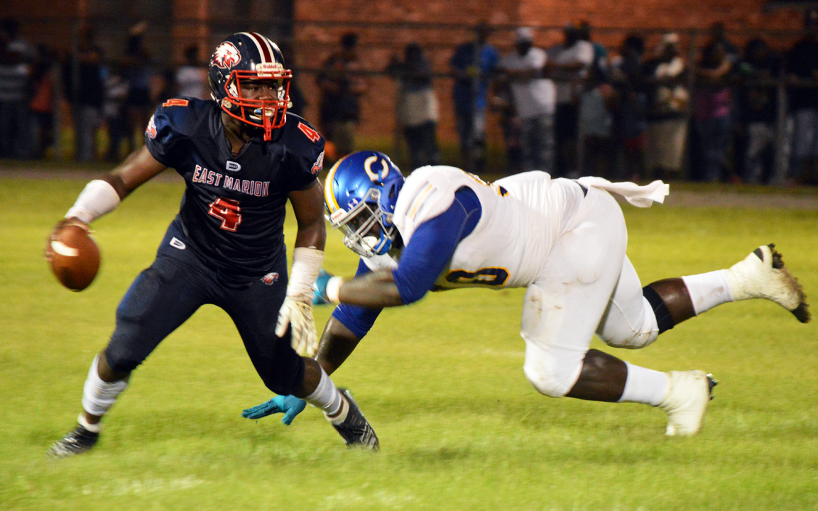 Pictured Above: East Marion quarterback Devin Daniels eludes the rush of Columbia's Jaheim Oatis. | Photo by Joshua Campbell