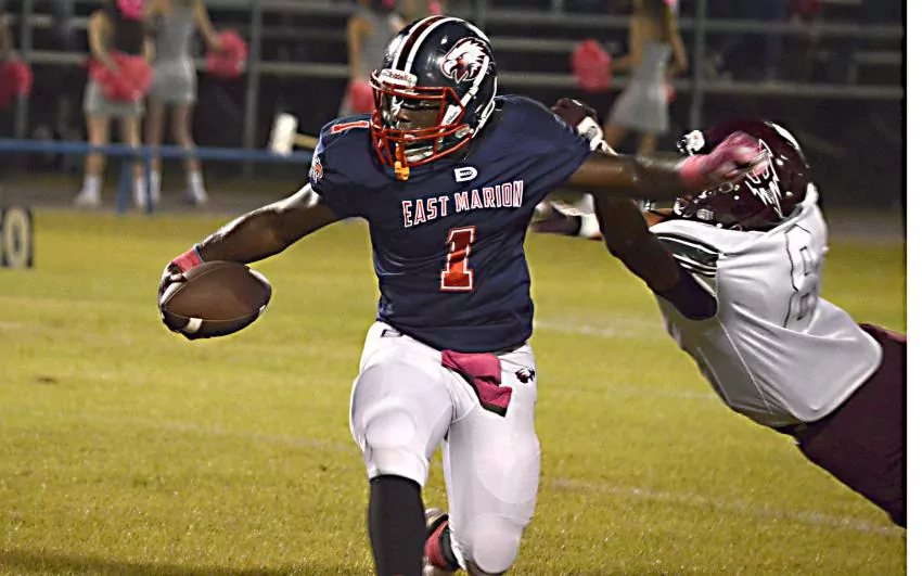 Pictured Above: East Marion's Devin Daniels attempts to elude a defender wih a stiff arm. | Photo by Joshua Campbell