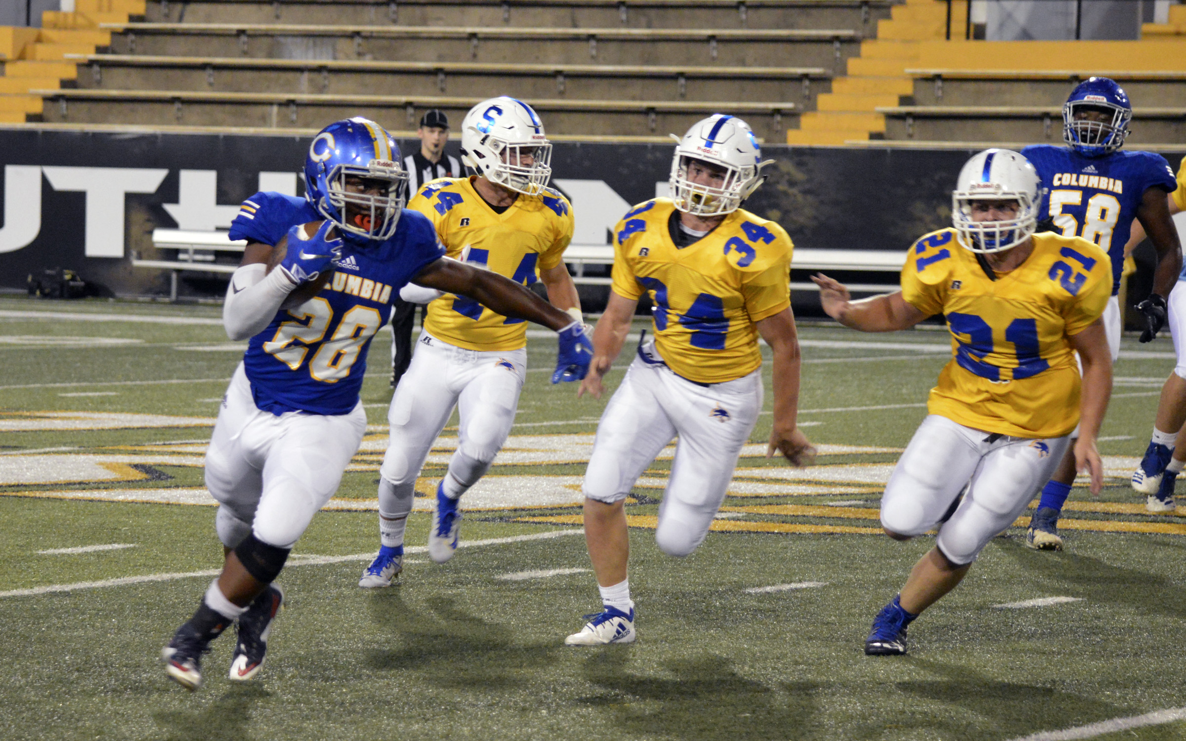 Columbia’s offense struck early and often, and its defense dominated throughout in a 30-0 drumming of the Bobcats. The game was structured as two 12-minute quarters or the equivalent of one half.