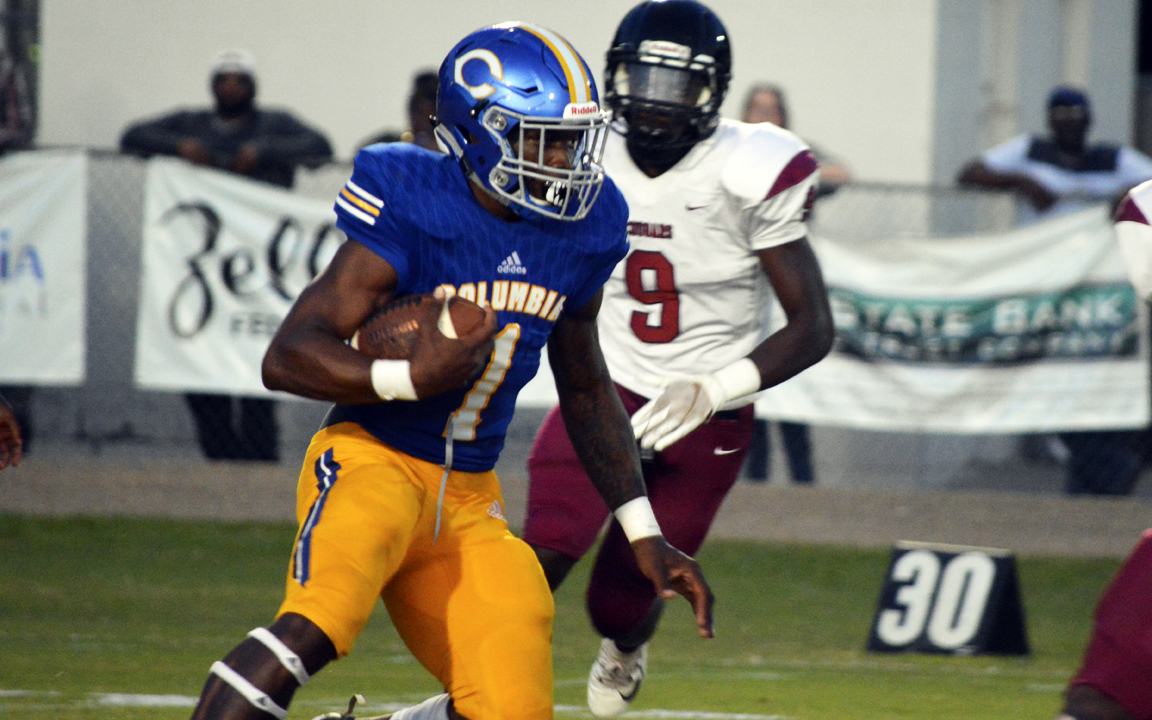 Pictured Above: Columbia's Kentrel Bullock looks for space against Lawrence County Sept. 20. | Photo by Joshua Campbell