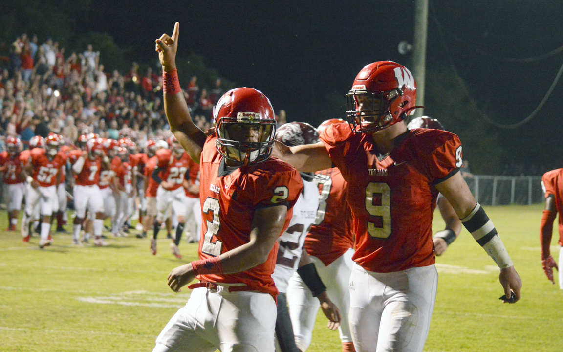 Pictured Above: West Marion quarterback Jeremiah Holmes celebrates the first of his four touchdowns Friday night with Jordyn Mahaffey. The Trojans face Sumrall on the road Friday. | Photo by Joshua Campbell