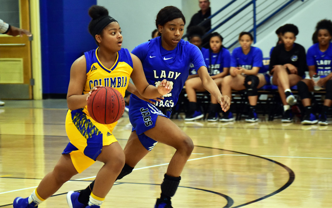 Pictured Above: Columbia's Jasmine Sheppard brings the ball up the floor against JDC Tuesday. | Photo by Charlie Smith
