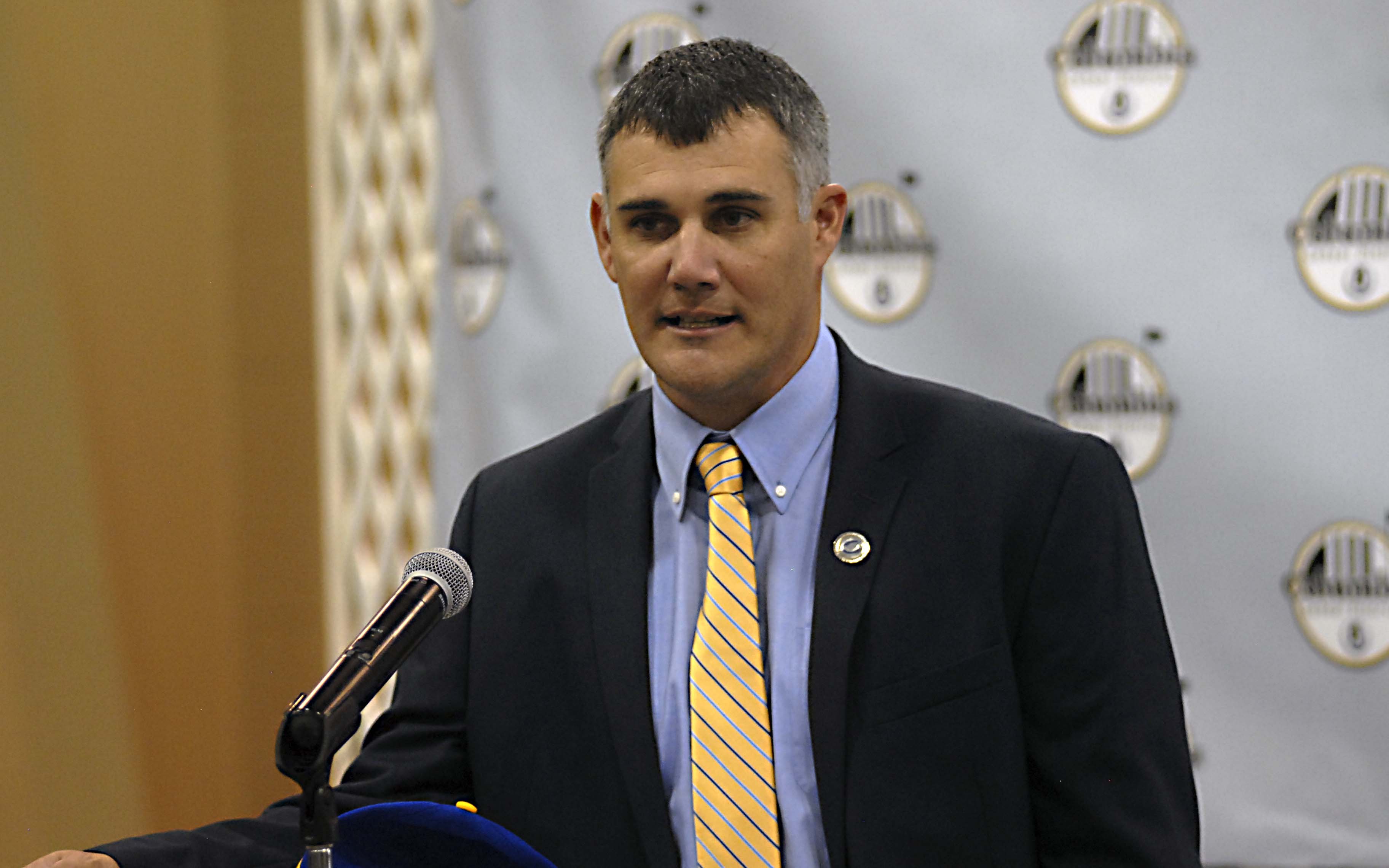 Pictured Above: Chip Bilderback addresses the crowd during his introductory press conference. | Photo by Mark Rogers