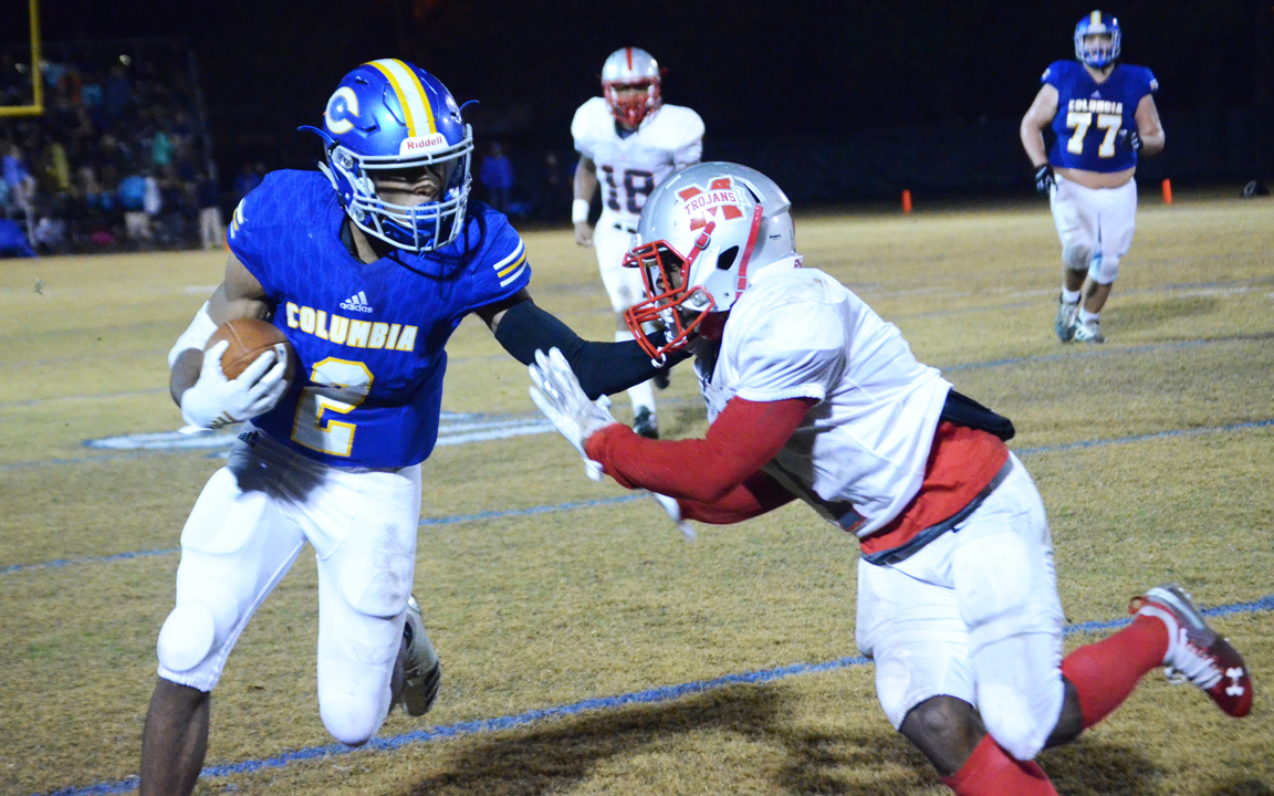 Columbia’s Jordan Aaron recovered another fumble to open the second half, and Johnson made a house call from 40 yards out to put the home squad up 21-0. Late in the third quarter Columbia added to its lead with a 60-yard rushing touchdown by Josh Brown. Jonathan Wiltz punctuated the victory with a 30-yard rushing score in the fourth quarter.
