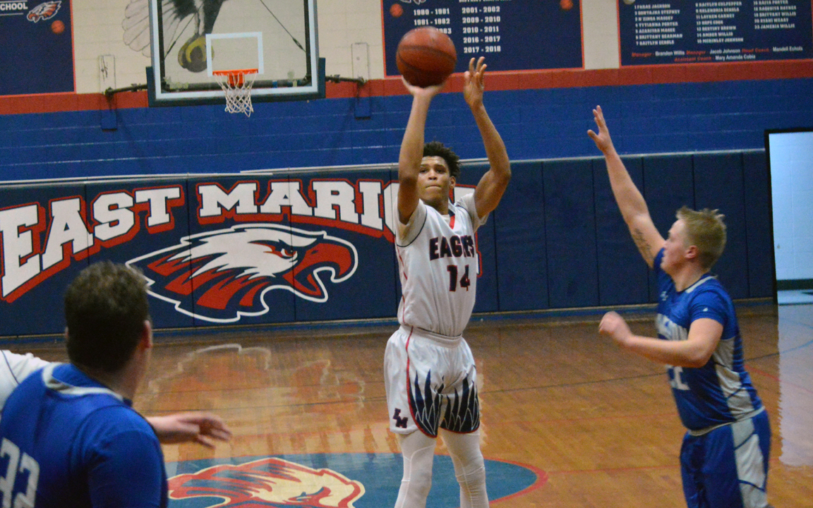 Pictured Above: East Marion's Caleb Rawls sinks a jumper in the playoffs. | Photo by Joshua Campbell