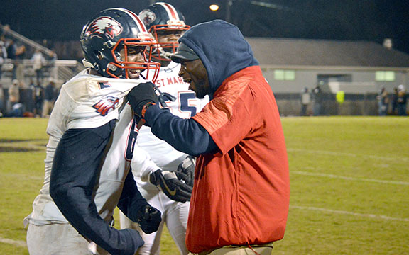 Caption: East Marion's Latrel Waller celebrates with assistant coach Shalamar Walker following his 85-yard pick-six to seal the Eagles' 26-14 upset win over Lumberton to advance to South State. Photo by Joshua Campbell.