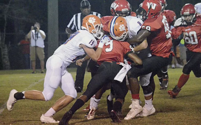 Pictured Above: Dontavius McGowan, Nolan Miller and Keyon Brister combine for a gang tackle on Columbia Academy running back Jake Brewer last Friday night. | Photo by Joshua Campbell