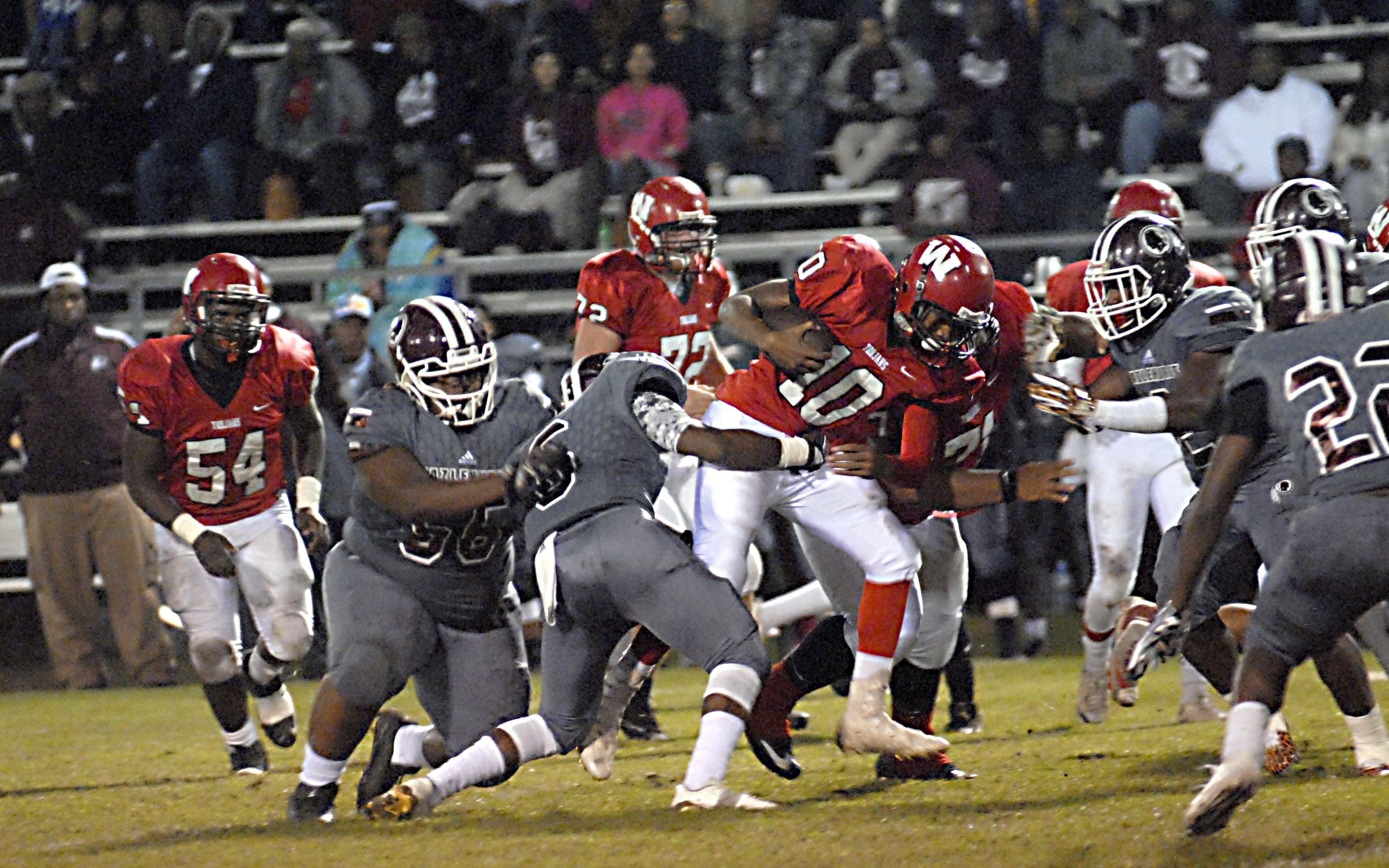 On the first play from scrimmage, Hazlehurst quarterback Quamead Stewart found himself in a heap of trouble — being pressured from his blind side and scrambling for his life. He made what typically is and should have been a terrible mistake by throwing late back across the field in double coverage. Two Trojans defensive backs were in perfect position to make a play on the ball but mistimed their jumps, and the ball fell into the waiting arms of Julius Brown, who sprinted for a 63-yard touchdown.