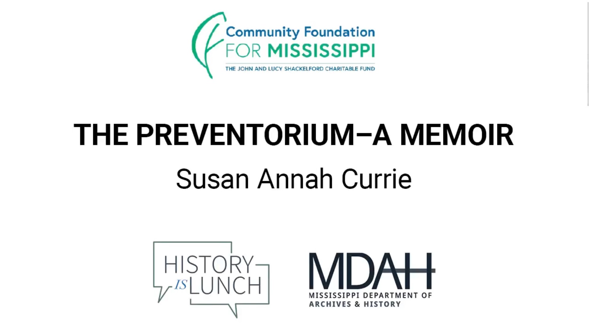 History Is Lunch is sponsored by the John and Lucy Shackelford Charitable Fund of the Community Foundation for Mississippi. The weekly lecture series of the Mississippi Department of Archives and History explores different aspects of the state's past. The hour-long programs are held in the Craig H. Neilsen Auditorium of the Museum of Mississippi History and Mississippi Civil Rights Museum building at 222 North Street in Jackson and livestreamed on YouTube and Facebook.