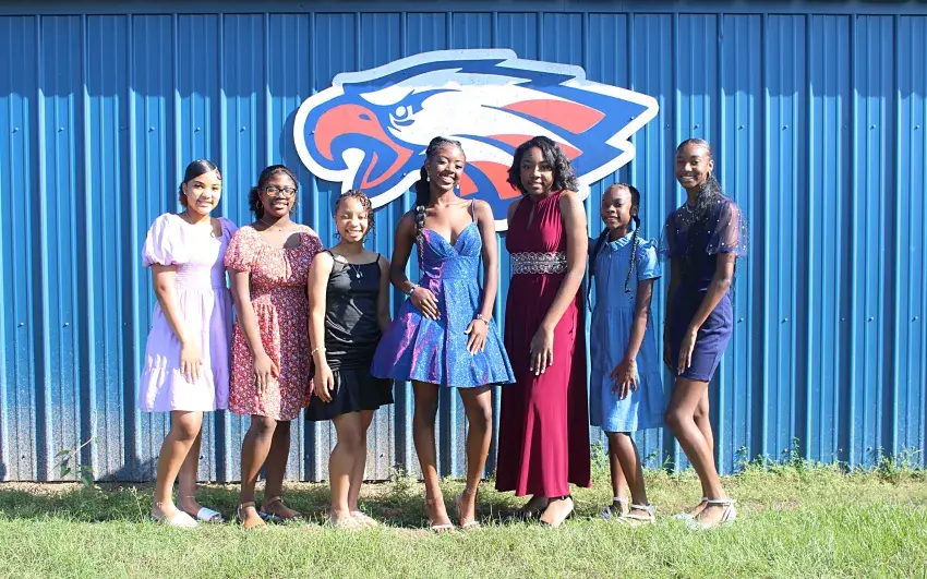 The East Marion Middle School Homecoming Court includes, from left, Eighth-Grade Maid Zakayjah Johnson, Seventh-Grade Maid Kyleigh Dawkins, Sixth-Grade Maid Hana Echols, Football Maid Trinity Davis, Sixth-Grade Maid Taelynn Foxworth, Seventh-Grade Maid Aubreigh Simon and Eighth-Grade Maid Adrianna Adams.