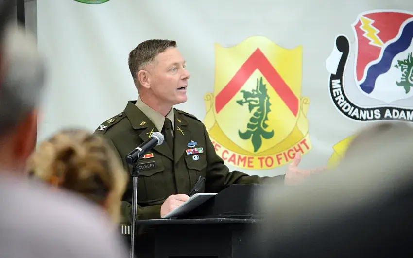 With a welcoming ceremony on Veterans Day, Nov. 11, the 155th Armored Brigade was welcomed to Columbia. The brigade moved its headquarters from Tupelo to Columbia to be closer to Camp Shelby. Above, Col. Christopher Cooksey speaks about how welcome he and his team have felt since arriving in Columbia.