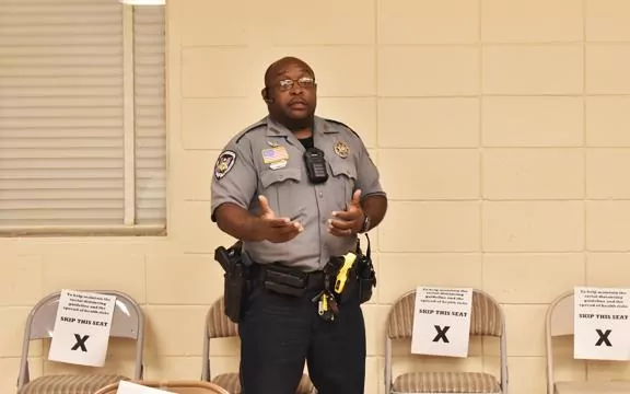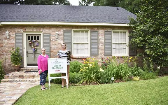 Danon Vest, left, recognizes Beth Pierce for having June’s Yard of the Month as they stand outside of Pierce’s home at 907 Sumrall Drive. Pierce said each of her plants has a story behind it. Her plants not only cover the front yard but the backyard as well. Pierce said one of her secrets is keeping a journal of the care of the plants.