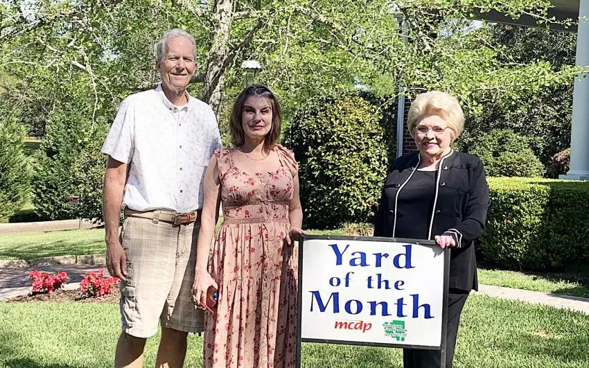 Jim and Angie Cagle are the owners of April’s Yard of the Month. The Cagles’ home is situated off of Broad Street on Keys Hill. Standing with the Yard of the Month sign are, from left, Jim Cagle, Angie Cagle and Barbara Prisk Parker with the Pine Needle Garden Club.