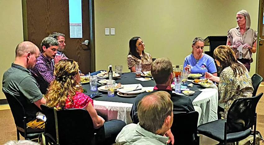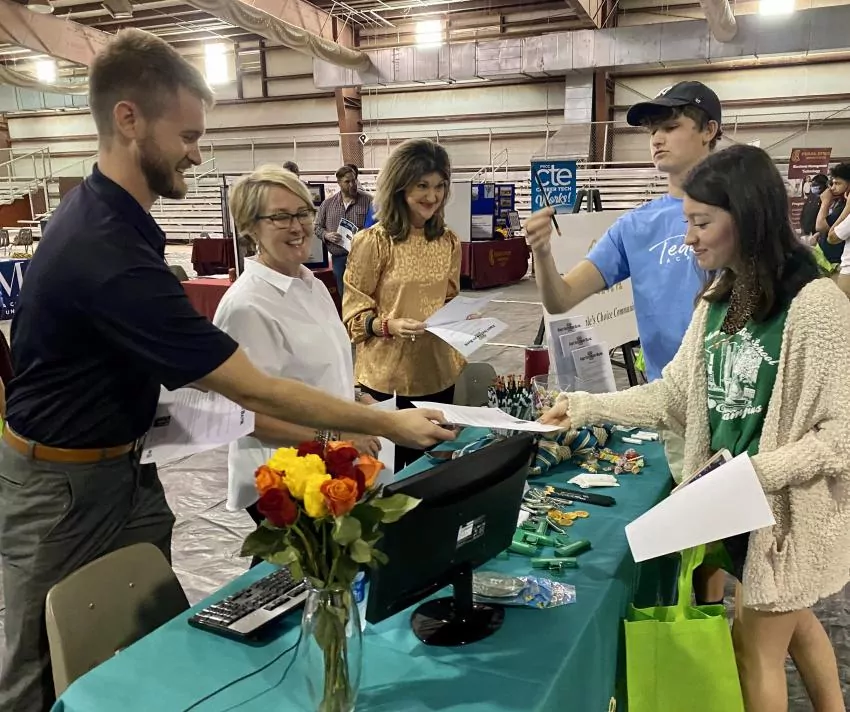 First Southern Bank employees (photo above), from left, Trenton Yawn, loan officer, Sandy Hutson, mortgage originator, and Dawn Baughman, mortgage lender, staff a booth at the annual Marion County College and Career Fair on Tuesday at the Columbia Expo Center Picking up banking information are Columbia High juniors, Kathlynn Davis, right, and Peyton Duncan. (Photo below), Katangelia Tenner, left, director of admissions at Alcorn State University, distributes campus and admissions literature to Columbia High juniors, Kelis Foxworth, center, and Deondra Hall, right. | Photos by Danny O'Fallon