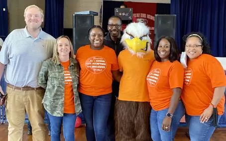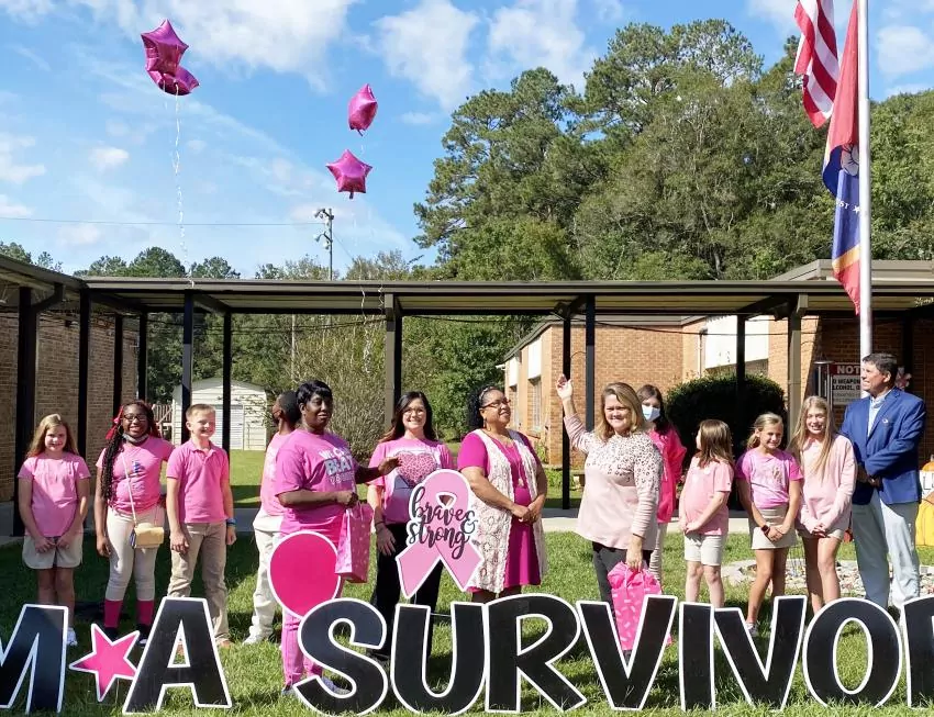 WME Principal Ryan Stringer, right, photo above, joins several students and staff for a balloon release on Oct. 19 for a Breast Cancer Awareness observance. From left are Morgan McKenzie, Ka'Lynn Brent, Devin Beach, Christopher Barnes, survivor Louise Thomas, Crissy Joyner, Karen Barnes, survivor Janis Beal, Alana Wilson, Khloe Burns, Griffyn Harmon and Layla Harvey. A special tribute table, photo below, was setup in the foyer at West Marion Elementary last week to recognize current and past breast cancer patients, as well as survivors, including WME staff members, from left, Louise Thomas, teaching assistant, and Janis Beal, fourth-grade teacher. | Photos by Danny O'Fallon