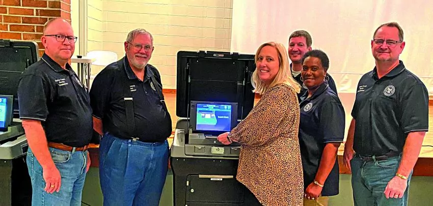 Marion County Circuit Clerk Janette Nolan, center, gathered Thursday with Marion County election commissioners to perform a thorough testing of the new voting equipment that will be used beginning with the next general election on Nov. 2. The election commissioners are, from left, Mike Bennett, District 1; Van Lowry, District 2; Dale Bracey, District 3; Jackie Hammond, District 5; and Stacy Reagan, District 4. | Photo by Danny O'Fallon