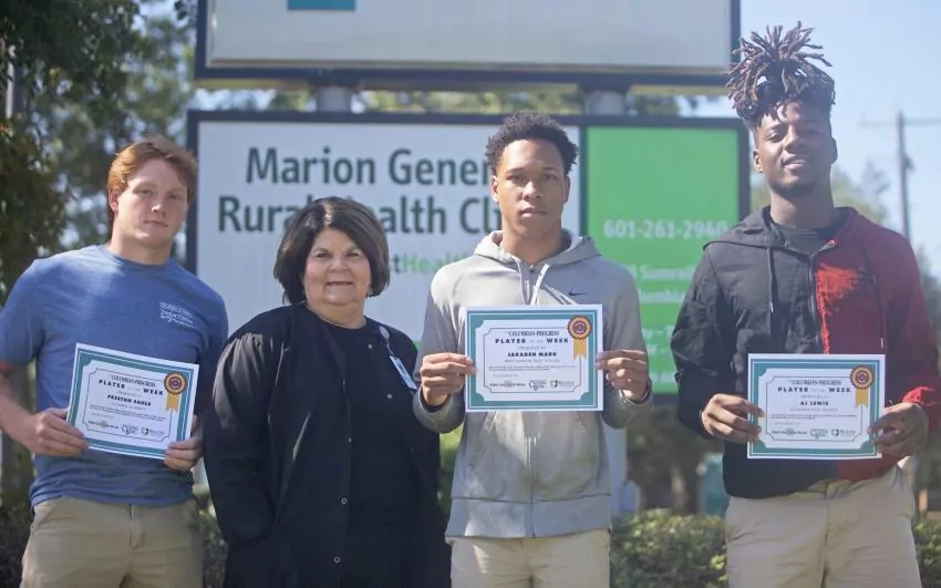 The Players of the Week for Week 3 are pictured with Marion General Hospital's Jackie Stovall. They are, pictured from left, Columbia Academy senior Preston Sauls, West Marion senior Jakaden Mark and Columbia sophomore AJ Lewis. Players of the Week is sponsored by Marion General Hospital, Citizens Bank and First Southern Bank.