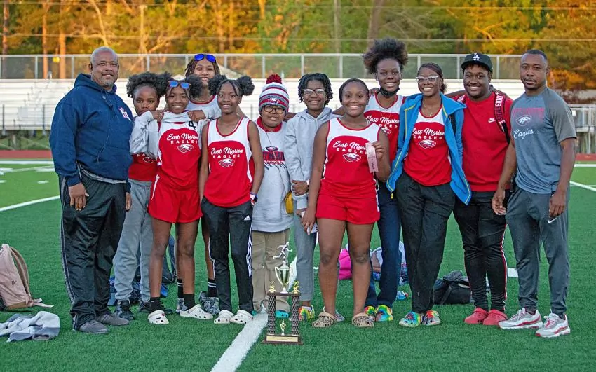 The Lady Eagles claimed first place April 7 in the Region 7-2A track and field meet at Columbia High School. They include, from left, assistant coach Rickey McKenzie, Destiny Stokes, Ashlyn Dillon, Destiny Brown, Aumni Dillon, Aspen Dillon, Ayanna McLin, Natalee Dillon, Angeleak Conerly, Jamieson Hooks and head coach LaRegus Thompson. | Photos by Brad Crowe & Joshua Campbell