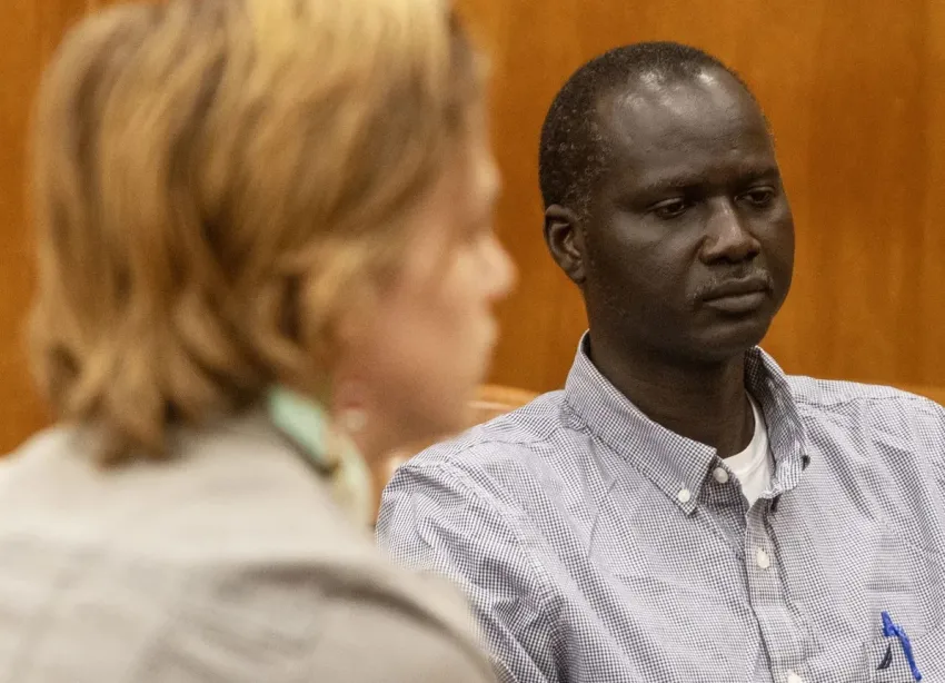 Bul Mabil, right, listens as Karissa Bowley answers questions during a court hearing concerning the investigation of the death of her husband, Dau Mabil, at the Hinds County Chancery Court in Jackson, Miss., on Tuesday, April 30, 2024. Credit: Eric Shelton/Mississippi Today