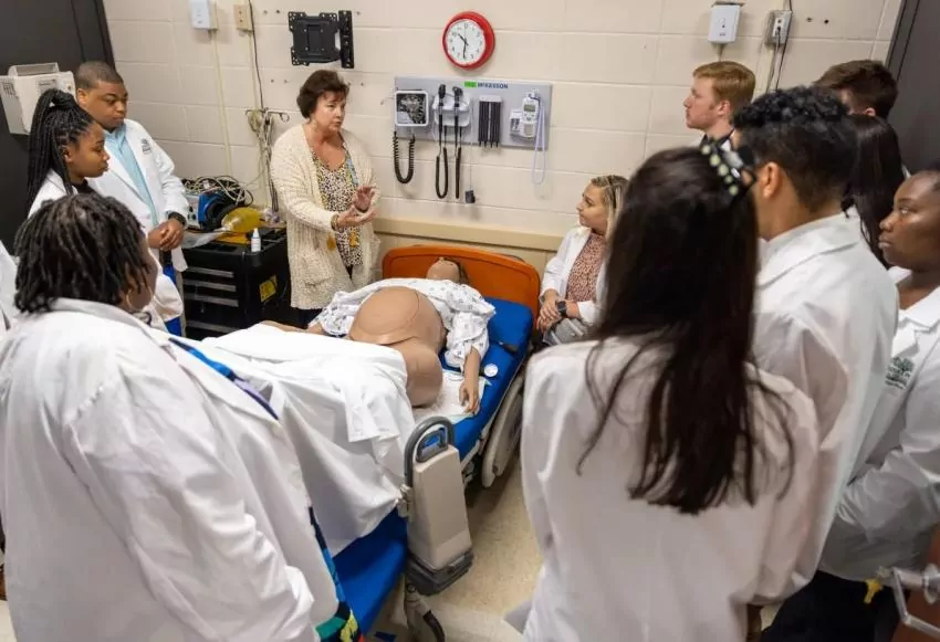 Kim Jackson, assistant director of the Innovative Learning Center, center, speaks to students, including Christian Hollis, top left, during the Mississippi Rural Physicians Scholarship Program Medical Encounter workshop at William Carey University in Hattiesburg, Miss., Monday, April 11, 2022. Credit: Eric Shelton/Mississippi Today