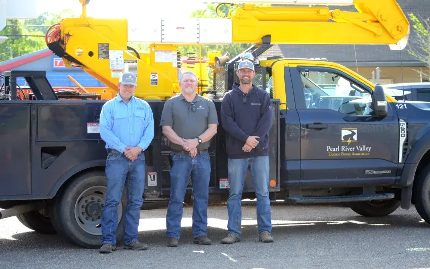 Pearl River Valley Electric Power Association employees, from left, Tony Moree, Gerald “Doodle” Williamson and Derrick Bell make sure residents of Marion County and beyond enjoy having the lights on as quickly as possible following an outage. | Photo by Jackson Howell