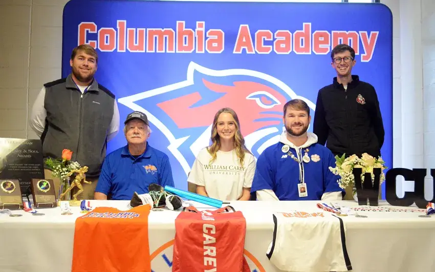 Macy Robertson signed her letter of intent to continue her athletic and academic career at William Carey Wednesday at Columbia Academy. She is joined by, from left, CA Athletics Director Keith Stanley, CA cross country head coach Duane Powell, CA assistant track coach Dylan Rhodes and William Carey cross country head coach Cooper Herrington. | Photo by Jackson Howell © 2024 Emmerich Newspapers, Inc.