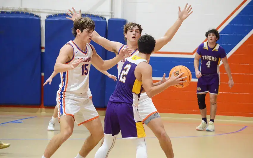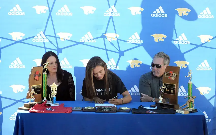 Charlee Brees Franks, winner of four state championships as a member of the Columbia Academy cross country team and the Columbia High track team, signs her letter of intent with William Carey alongside her parents Nov. 14. | Photo by Jackson Howell © Emmerich Newspapers, Inc. 2024